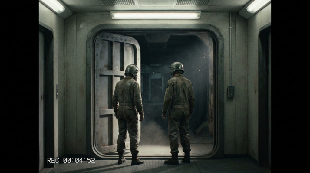 施設内で繰り返し強調されるのは、空間の広さと実際に使える範囲の乖離です。通路は奥まで続いているように見えますが、照明や隔壁によって進行方向は限定されます。人物は常に画面の一部に押し込められ、余白が不安定さを生みます。何かが現れていなくても、配置そのものが状況の危うさを語る構図となっています。アクションや派手な演出に頼らず、立ち位置や距離によって緊張を積み重ねていく点が、本作の視覚的な特徴です。
