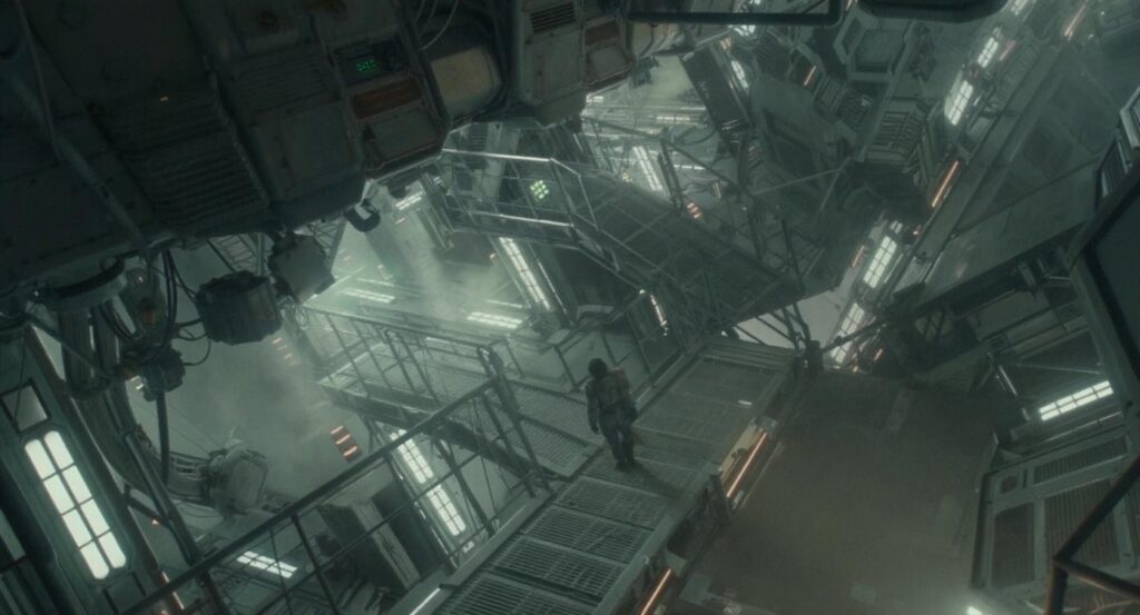 宇宙施設の内部を進む一行が、ある区画の前で足を止める場面があります。扉は半開きの状態で固定され、完全には閉じていません。その隙間から見えるのは、広さの把握しづらい暗い空間です。誰も中へ入ろうとせず、カメラも距離を保ったまま動きません。人物の背中越しに、開いた扉の奥が画面の大半を占める構図となり、観客は中を覗き込む立場に置かれます。音楽はなく、聞こえるのは装置の作動音と呼吸音だけで、時間が引き伸ばされたように感じられます。