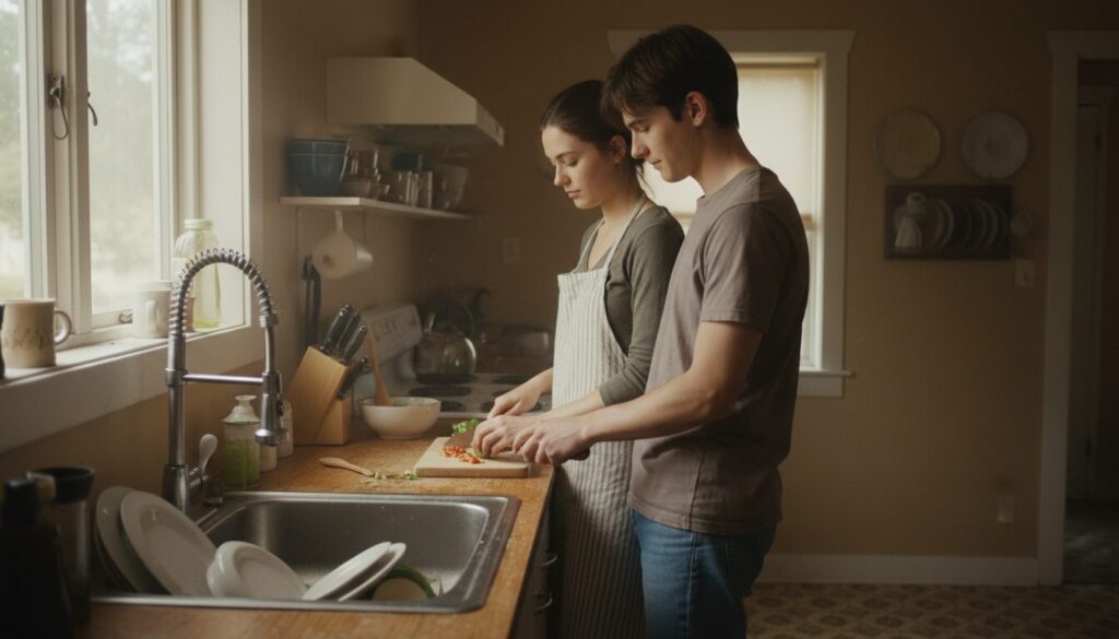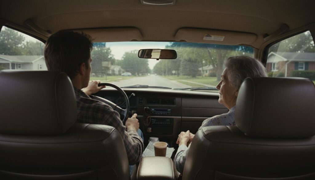 現代アメリカの地方都市で、夫婦が同じ家に暮らし、日常を続けている状況です。仕事、家事、子どもとの時間といった生活の要素が、特別な説明もなく画面に置かれています。物語は出来事を追うというより、同じ時間を過ごしているはずの二人が、どの場面で同じ判断をし、どの場面で別の選択をしているのかを積み重ねていきます。夫は家庭の内部に留まりながら行動を選び、妻は外の世界と家庭の両方に関わる立場にいます。その役割の違いが、日々の小さな判断に影響を与えます。過去の時間では、同じ二人が似た状況に置かれており、そこで何を選んだのかが現在と並べて示されます。画面に現れるのは、車、部屋、共有する空間といった限られた具体物です。それらを誰がどの位置から見ているのかに注目すると、行動の流れが追いやすくなります。何かが決定される場面だけでなく、何も選ばれなかった時間が繰り返し置かれている点に目を向けると、関係の進み方が見えてきます。