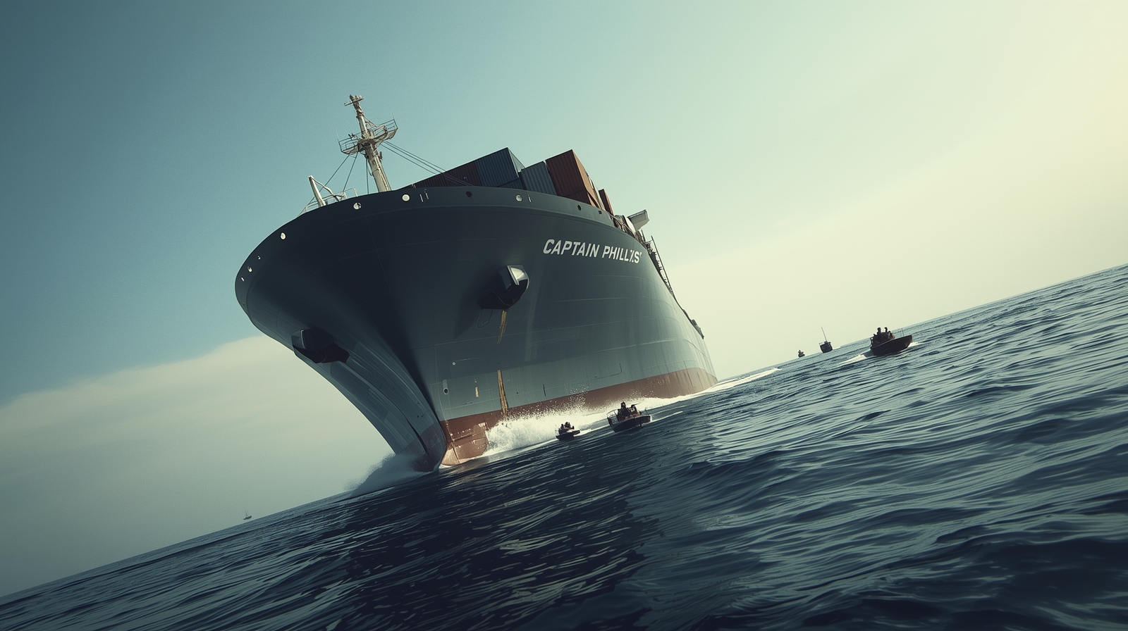 フィリップス船長は貨物船メアースク・アラバマを率いて航行準備を進め、乗組員に危険海域を通過する際の手順を確認しながら、船内の空気を整えていきます、彼の声音には慎重さが漂い、規律を守る重要性が短い言葉で伝えられ、乗組員たちは工具の点検や区画の施錠を淡々と進めます、海は穏やかに見えますが、距離の先に映る小さな漁船の動きがゆっくりと近づき、船橋のモニターに映る反応が緊張を生みます、フィリップスは偽装の可能性を判断し、警戒態勢を取るよう指示を出し、無線で警備機関に連絡を送ります、しかし周囲の海は広く、応援の見込みが薄いことがすぐに明らかになり、乗組員の間に不安が広がります、エンジン音の高まりとともに細い船体が迫り、海賊の姿が露わになると、船内は半ば暗い照明に包まれ、物音が一段と大きく響きます、フィリップスは乗組員を安全な場所へ誘導しながら、相手の動きに応じて判断を重ね、海の孤立した空間で状況が緊迫していきます。