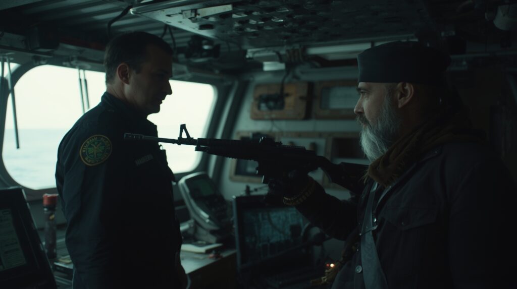 海賊が船に乗り込むと、船内の空気は一気に張り詰め、狭い通路に声と足音が響き、乗組員は隠れながら機械室を中心に物資を移動させ、フィリップスは彼らから注意を逸らすため前へ出る道を選びます。ムセは銃を構えながらも周囲を慎重に観察し、仲間の動きを促し、フィリップスの態度を測るように視線を送ります。双方の距離は近いのに決して交わらず、言葉の端に緊張が乗り、船内の温度がわずかに上がるように感じられます。乗組員は密閉された区画で息を潜め、通気口を通るわずかな音を聞き分け、次の行動に備えます。ムセたちの内部にも不安があり、金銭や帰路の話題が短い会話で飛び交い、焦りが動きのぶれに現れます。フィリップスは危険を承知で交渉を試み、状況を少しでも遅らせようと時間を稼ぎ、海の上に漂う薄い風が船体を揺らすたび、緊張が数秒だけ途切れ、またすぐに戻ります。やがて乗組員の気配が海賊の警戒を呼び、状況は次の局面へ移ります。