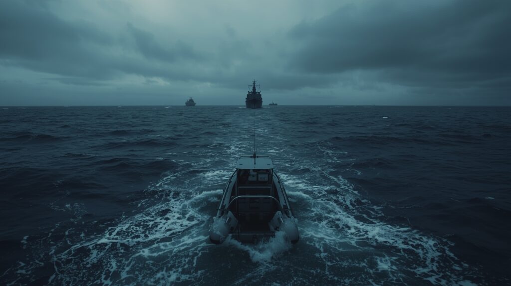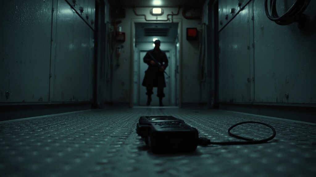 海軍の船影が夕暮れの海に浮かぶ中、救命艇の内部でフィリップスが一人で座る場面があります。狭い室内に差し込む光が壁に沿って揺れ、彼の額を照らし、汗が細く流れ、呼吸が一定のリズムで続きます。遠くから低いエンジン音が響き、海の波が救命艇の底を打つたびに内部の影が少しずつ動き、時間が伸びます。フィリップスは目を閉じかけながらも外の音に耳を澄ませ、次の瞬間に備えるように姿勢を変えます。海賊たちの囁き声が後方でわずかに混ざり、緊張が途切れないまま室内に溜まり、微かな光の揺らぎがその空気を際立たせます。外の海から届く風が救命艇の小さな窓をわずかに揺らし、その動きが静かに未来を示し、誰もが行き先を決められないまま時間が過ぎていき、この緊張の中に生存とは何かが浮かび上がります。