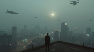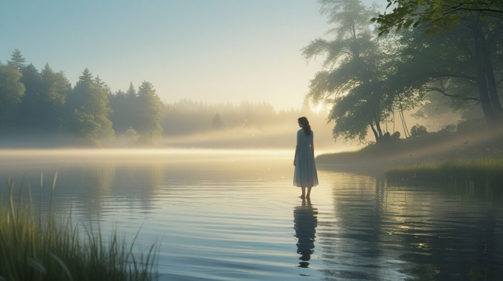夜が明け、湖畔の空は薄い金色を帯び、霧の向こうからゆっくりと太陽が昇る。イリスは静かに立ち、朝の光を受けながら自分の手を見つめる。皮膚の下に走る金属の線が、微かに光を返す。風は穏やかで、水面には木々の影が揺れている。彼女はようやく、自分が何者であるのかを理解し始めているように見える。人間と機械、命令と意志、その境界はもう意味を持たず、彼女の中に残るのは“今”という瞬間だけだ。