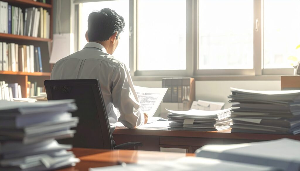 書類保管庫の奥で、弁護士が段ボール箱を床に下ろします。蛍光灯の白い光が均一に降り、影はほとんどできません。箱のふたを開け、無言で紙束を一枚ずつめくっていきます。紙が擦れる乾いた音だけが続き、周囲の空間は静止したままです。文字の並びに目を落としたまま、身体はほとんど動かず、視線だけが左右に移ります。ページをめくる指先は止まりかけ、次の一枚に触れるまでにわずかな間が生まれます。背後で人の気配はなく、時計の音も聞こえません。積み上げられた箱は視界の端まで続き、出口は見えにくい位置にあります。紙面に残る古い日付と均質な書式が並ぶ中で、次に進むか、箱を閉じるかの判断はまだ下されません。その直前の静けさが、空間全体に張り付いたまま保たれていま
