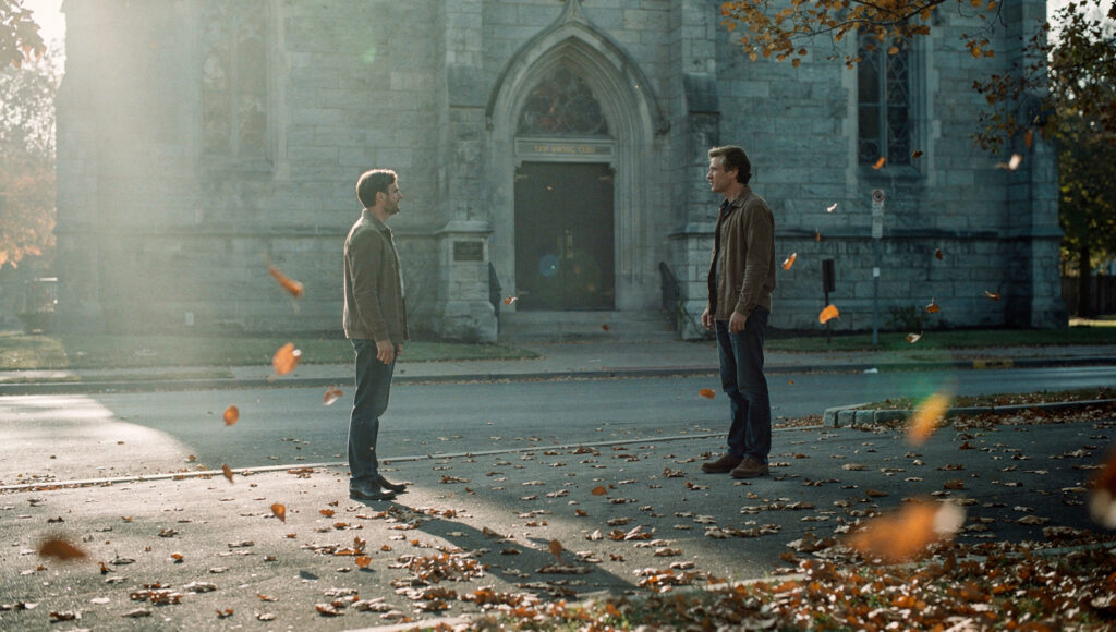 教会前の通りで、早朝の薄い光が街を照らし始める中、バートルビーが一人立ち尽くす場面が印象に残ります。風がわずかに吹き、落ち葉がアスファルトを転がる音が静かに響き、彼は沈んだ表情で遠くの空を見上げます。