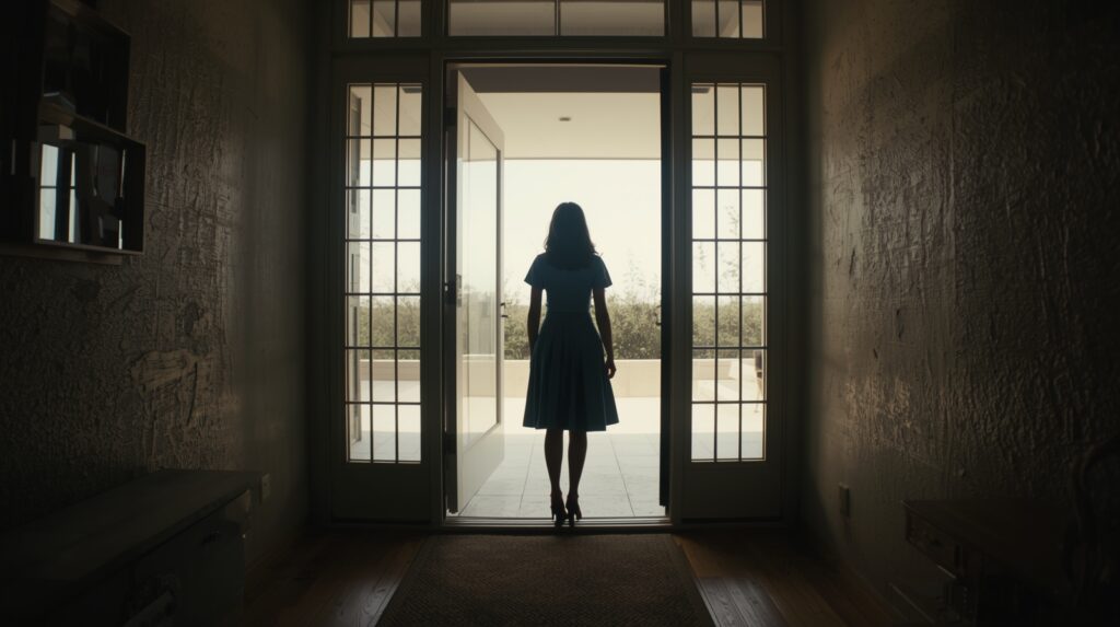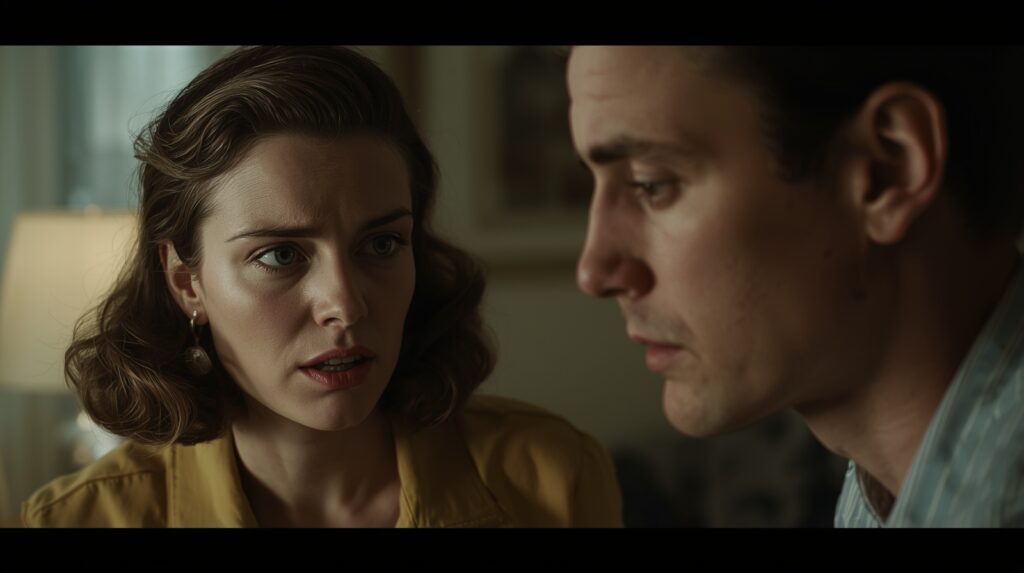 街のパーティーシーンでは、音楽と笑い声の裏にある沈黙が強調され、アリスの視線が向けられた先にあるわずかな矛盾が画面に残ります。夫ジャックの反応や周囲の妻たちの動きが揃いすぎていることで、生活に潜む欺瞞が静かに姿を現し、監督は会話の間を活かして表面上の美しさと内側の緊張を対比させます。