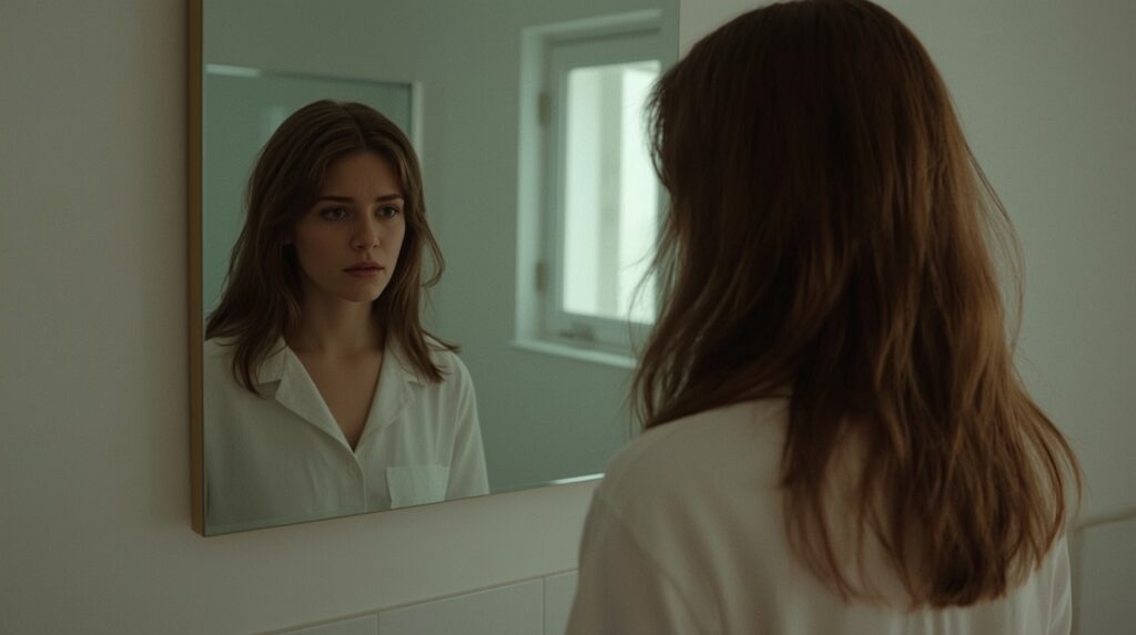 アリスの視線に寄り添う構図が続き、整った街並みと人物の動きが重なることで、人々がどのように日常を受け入れ、どこに疑問を抱くのかが自然に伝わります。監督は光の色や影の伸び方を丁寧に調整し、朝と夕方の変化をアリスの心理に合わせるように配置し、完璧な世界の裏にある緊張を静かに積み上げます。遠景と近景を交互に繋ぐ編集が生活の歪みを浮かび上がらせます。