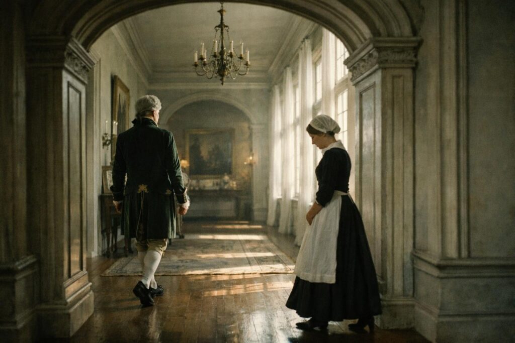 印象に残るのは、劇的な事件よりも、屋敷の朝が始まるときの流れです。階下では複数の足音が同じ方向へ動き、湯気と食器の音が混じり、短い指示と返事が交差し、誰もが自分の持ち場へと戻っていきます。階上はその間まだ静かで、扉の向こうの空気だけが少しずつ温まり、ようやく一日の会話が始まります。カメラは急がず、誰か一人を英雄のように追うこともなく、動線をなぞることで秩序の形を見せ、同じ手順が繰り返されるたびに、ほんのわずかな違いを浮かび上がらせます。誰かの返事が遅れたり、視線が一度止まったり、歩幅が小さくなったりするだけでも、屋敷の内部に入り込んだ変化がわかり、別れの瞬間よりも、その前後に漂う沈黙のほうが長く残ります。終わりは宣言されず、ただ生活の手順が少し変わる、その小さな差異として、積み上がっていきます。
