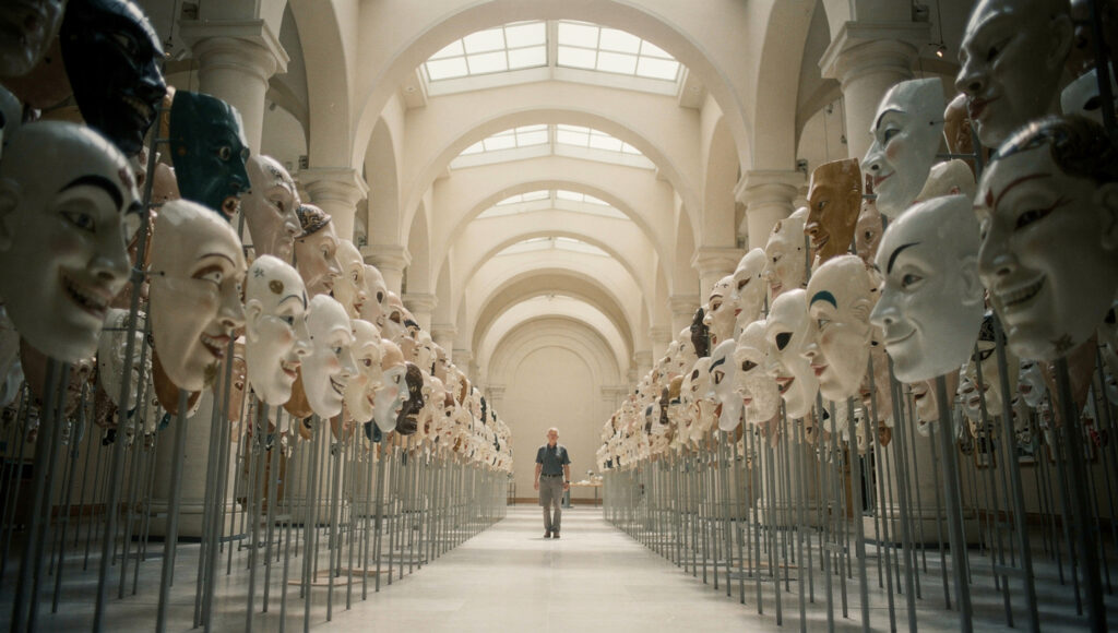 靴音は一定の間隔で床に触れ、周囲の呼吸が抑えられたように静まります。照明は高い位置から淡い光を落とし、仮面の表面だけが微かに光を返します。動かない視線が空間を固定し、その中でビルだけがわずかに動き続けます。