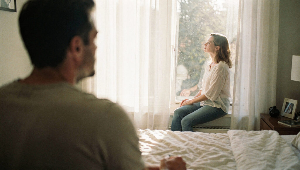 アリスの表情にも揺らぎが残り、ふたりの間に沈黙が増え、家の中の時間が日常に戻っているようで戻らない感覚を帯びます。