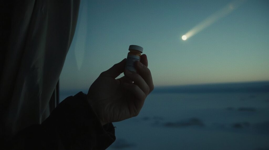 暗い空に彗星の尾が細く伸び、落下する破片の光が遠くの地平線を照らし、道路脇の街灯が一つずつ消えていく中で、ジョンの車がゆっくりと進み、フロントガラスに映る光が揺れながら家族の表情を照らします。車内には無言の時間が続き、アリソンがネイサンの手を包む仕草が小さく揺れ、エンジン音が静かに空気を満たし、外の景色がわずかに赤味を帯び、遠くで轟く音が重く響き、時間の流れが一瞬止まるように感じられます。道路を照らす光が途切れ、ヘッドライトが前方の空間を切り開くように進み、ジョンの視線は前方から逸れずに緊張を帯び、アリソンはわずかな呼吸の変化で不安を抑え、ネイサンは静かに外の光を追い、車内には三人の呼吸が重なる音だけが残り、世界が変わり始める瞬間が淡々と積み重なり、家族の選択が画面に静かに刻まれます。この映画の核は、極限の中で家族が寄り添う姿勢です。