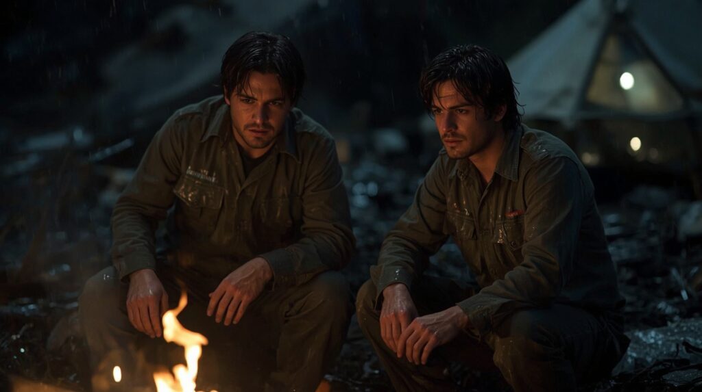 夜明け前の森に漂う湿気と焦げた匂いが、金属の残骸を包み込むように漂い、壊れた機体の翼はわずかな光を反射しながら、風に鳴らされて微かな音を立てている。トランスは座席の残骸に腰を下ろし、静まり返った無線機を見つめ、ノイズの繰り返しに耳を澄ませるたび、指先がかすかに震える。背後ではルイスが焚き火を消し、銃を抱えたまま空を仰ぎ、その表情は夜と朝の境に沈んでいる。音が次第に消え、鳥の鳴き声すら止まり、世界が息を潜める。