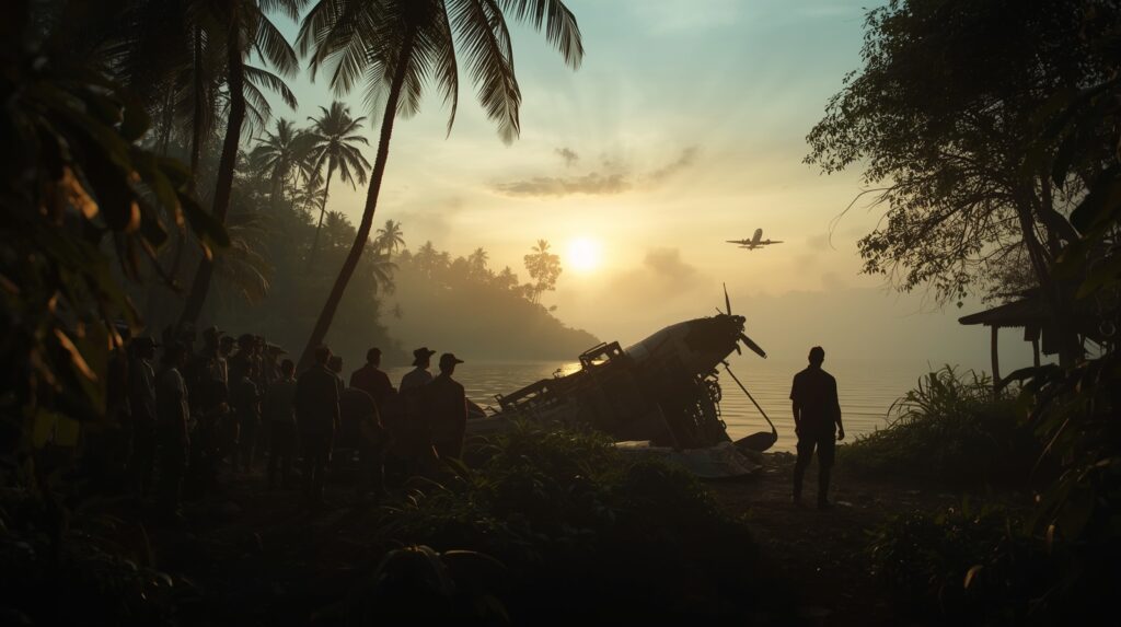やがて嵐が機体を包み、落雷と同時に計器が狂い、通信は途絶える。副操縦士サミュエルと共にトランスは必死の操縦を続け、わずかに映る陸地に向けて機体を降下させる。「ここしかない」。その判断と共に、飛行機は闇の中に滑り込み、激しい衝撃と共に静寂が訪れる。残ったのは生き延びた数十名の乗員乗客と、破壊された機体だけだった。