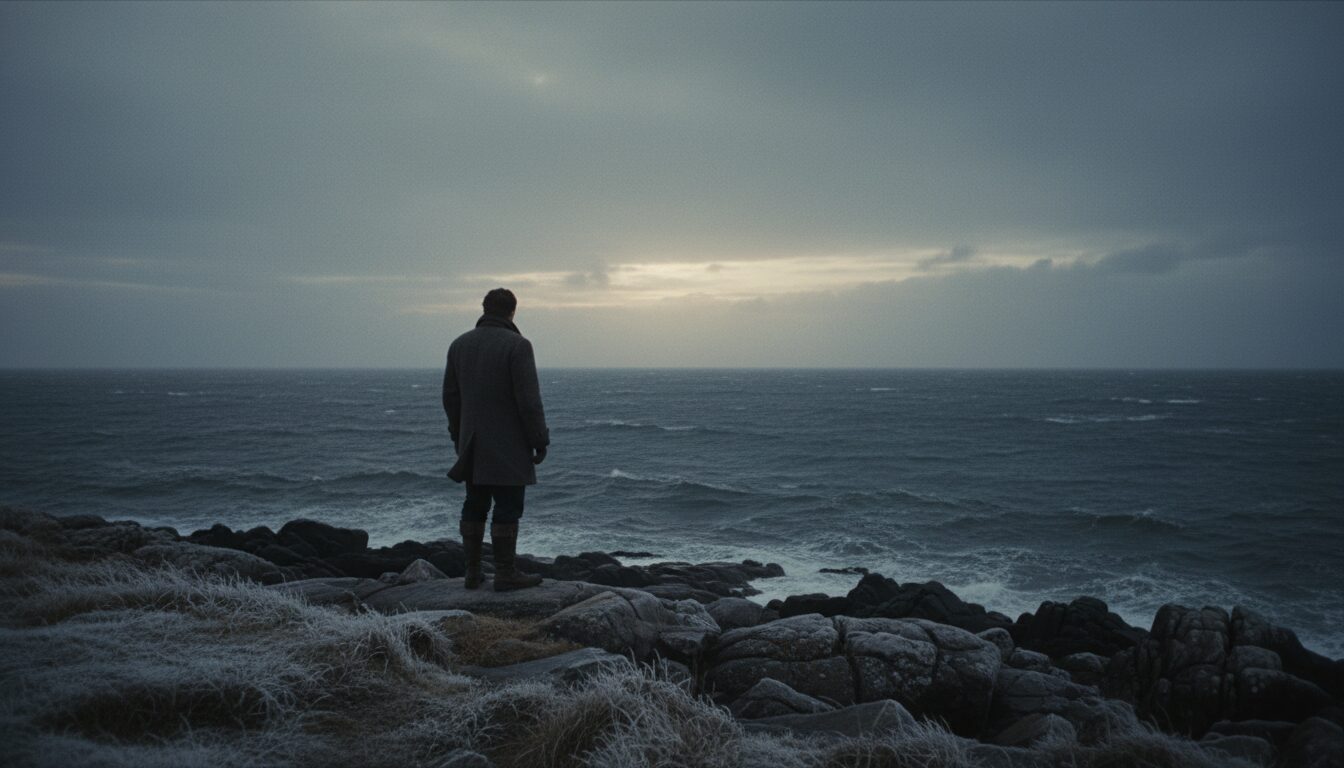 室内の暖房が弱く、外の冷気が完全には遮断されていない家の中で、男性は立ったまま動きを止めています。向かいには若者が座り、何かを言おうとして口を開きかけたまま、言葉を探しています。二人の間には数歩分の距離があり、家具も物音も、その隙間を埋めようとはしません。窓の外からは港の風の音が遅れて届き、室内には時計の針が進む微かな音だけが残っています。男性の手は下げられたままで、肩も背中もわずかに前へ傾いていますが、歩み寄る気配はありません。若者の視線は一度床に落ち、再び相手に戻りますが、身体は椅子から離れません。その間、カメラは動かず、二人を同じ画面に収め続けます。会話は成立しかけては中断され、沈黙が短く切れては戻ってきます。何かが起こる直前の状態だけが引き伸ばされ、時間がその場に留まっているように見えます。