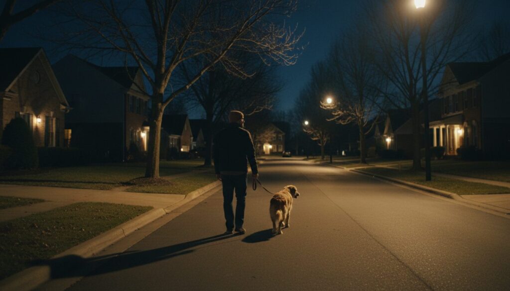 バスの運転を終えた夕方、男は犬を連れていつもの道を歩いています。通りの照明はすでに点き、舗道の影は一定の長さで足元に落ちています。リードを引く手は力を入れず、犬の歩調に合わせて前後に揺れています。足音と首輪の金属音だけが、周囲の静けさの中で間隔を保って続きます。