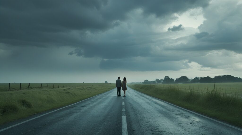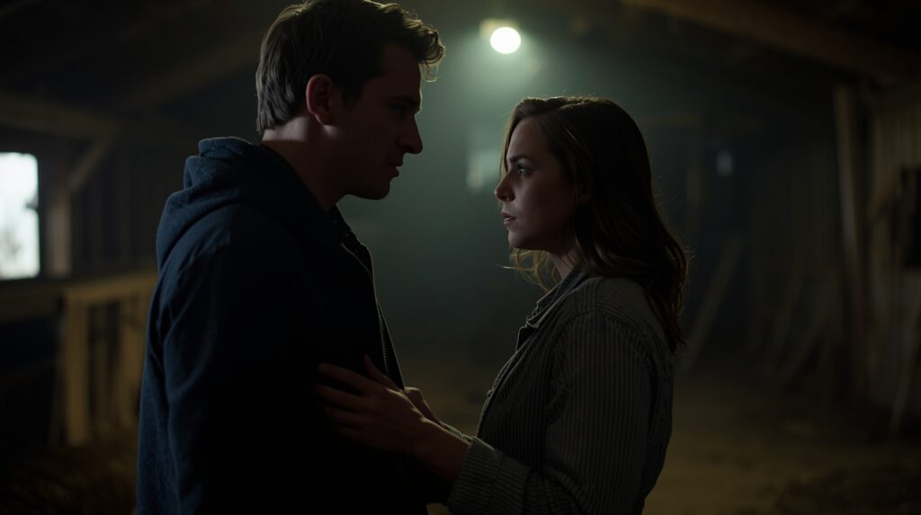 夜の農場、外灯の光がわずかに届く納屋の中で、リアムとジェーンが互いの距離を確かめるように立つ。光が二人の間に細い境界を作り、足を一歩でも踏み出せば命を奪う緊張が漂う。息の音さえ聞こえるほどの静けさの中で、ジェーンの手がわずかに震え、リアムはその手を包もうとして止まる。風が通り抜け、埃が舞い上がり、時間がゆっくりと伸びていく。カメラは二人の表情を切り返しながら、照明を落としていく。光が消える瞬間、沈黙が全てを語る。そこに残るのは、恐れでも愛でもなく、真実を見つめる意志だった。