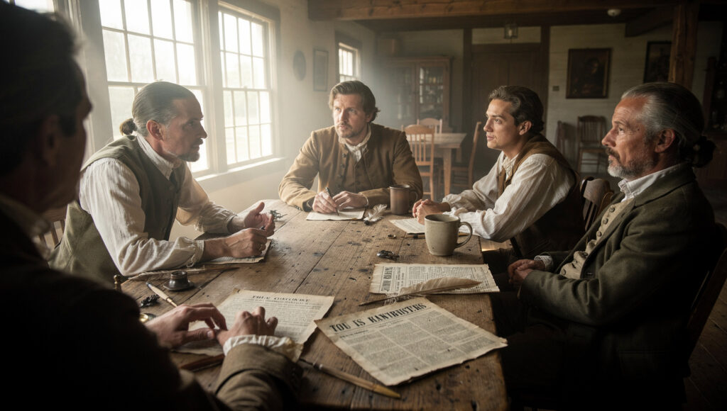 革命は外部との戦争であると同時に、内部の分断を深める過程でもありました。家族や隣人同士が異なる立場を取り、沈黙や距離が日常の中に入り込んでいきます。再現映像では、対立が直接的な衝突として描かれるよりも、視線を合わせない仕草や、集会での立ち位置の違いとして表現され、その緊張が持続します。分断は、一時的な混乱ではなく、選択の結果として社会に残り続けるものとして示されます。