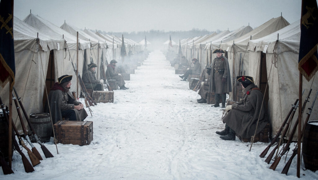 夜明け前の野営地で、兵士たちが焚き火を囲み、誰も言葉を発さないまま時間が過ぎていきます。雪が地面を覆い、靴底が沈むたびに鈍い音が残り、銃や旗は画面の端に置かれたまま、中心にあるのは、動かない身体と、わずかな呼吸だけです。誰かが指示を出すわけでもなく、勝敗を語る声もなく、ただ「待つ」という行為が続き、寒さと疲労が均等に共有されていきます。