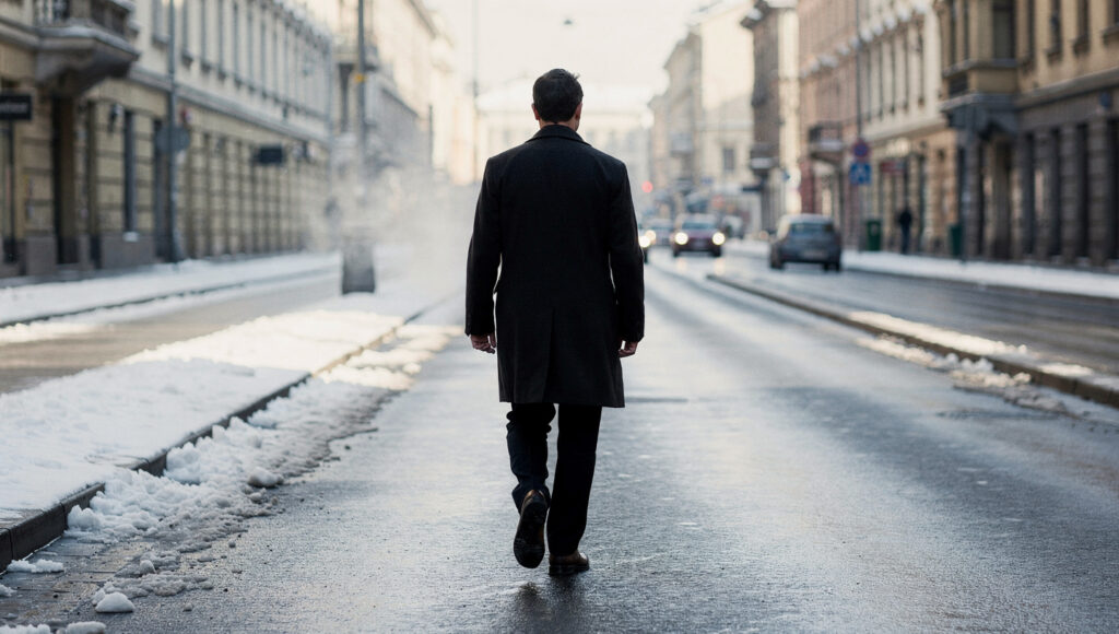 モスクワの冬空に薄く雪が舞う通りを、ボーンがゆっくり歩きます。呼気が白く変わるたびに足元の雪がきしむ音を残し、遠くから救急車のサイレンが途切れ途切れに響きます。彼の歩幅は一定に保たれ、街灯の弱い光が顔の半分を照らし、もう半分は影に沈みます。地面に落ちた光の模様が揺れながら進む方向を示すように伸びていきます。