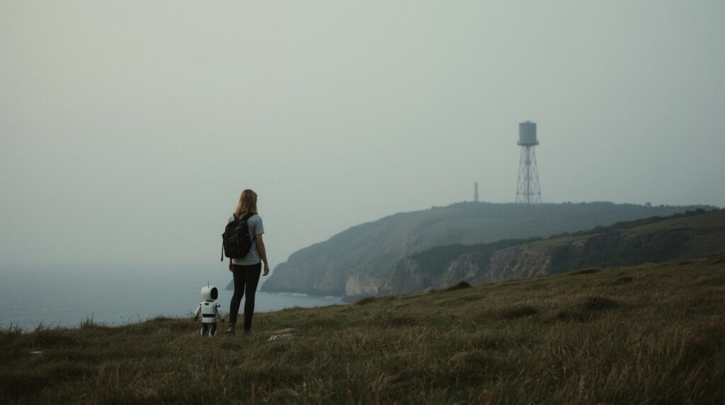 夜明け前の荒野に、街の光は一つも見えません。空に浮かぶのは、壊れたドローンの群れ。風が砂を巻き上げ、遠くで金属の鳴る音がします。ミシェルはその音に耳を澄ませ、誰もいない空へ向けて小さく「聞こえる?」と呟きます。答えはなく、ただ風の音が返ってきます。カメラは背中を追い、コスモがその横を静かに歩いています。機械の瞳に夜明けの光が映り、空が少しずつ色づきます。