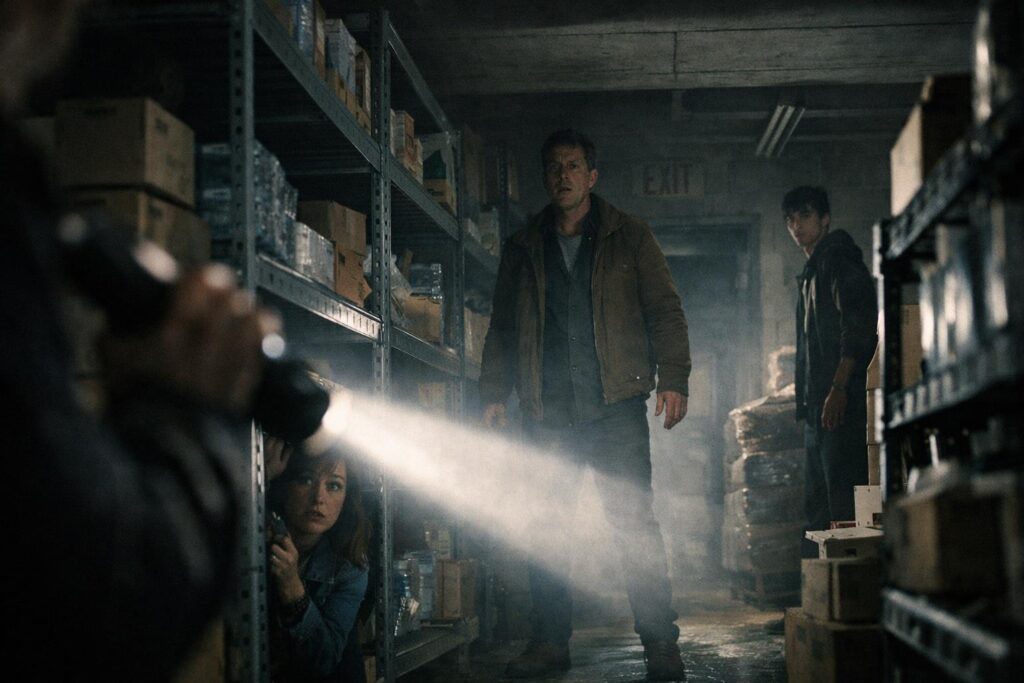スーパーマーケットの自動ドア越しに霧が流れ込む場面では、光が均一に拡散し、人物の輪郭が曖昧になります。人々は無意識に互いの距離を詰め、カートを盾のように前に出しながら、足元だけを確認します。音は天井に反射し、どこから来たのか判別できず、視線は常に入口に固定されます。倉庫に入る際、懐中電灯の円が壁をなぞり、動作が一拍遅れるたびに呼吸が乱れます。誰かが一歩前に出ると、別の誰かが半歩下がり、集団の重心が揺れ続けます。霧の中へ車を進める場面では、ワイパーの規則的な動きと、フロントガラスに残る白さが、時間の感覚を奪います。希望を語る言葉よりも、ハンドルを握る手の硬さが印象に残ります。