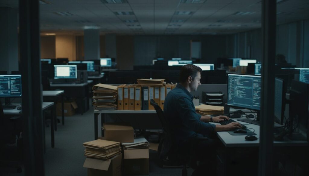 機密施設の個室で、調査担当者が端末の前に座っています。画面には黒塗りの多い文書が表示され、白い背景が静かに光っています。椅子に深く腰掛けたまま、背筋は伸び、指先だけがトラックパッドの上で止まっています。ページを送る直前、空調の低い音だけが室内に残ります。窓はなく、壁との距離も一定で、外の時間は感じられません。次の文書に進めば、また同じ形式の記録が続くと分かっていながら、その一動作が遅れます。画面に映る日付と部署名は無機質で、個人の痕跡は見当たりません。背後から声はかからず、時計も視界に入りません。視線は画面に固定されたまま、進むか留まるかの判断が下されない状態が続きます。その一瞬、作業は止まり、部屋全体が同じ緊張を保ったまま静止しています。