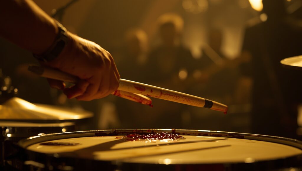 血のにじむスネア、壊れたスティック、そして深く息を吸う音。